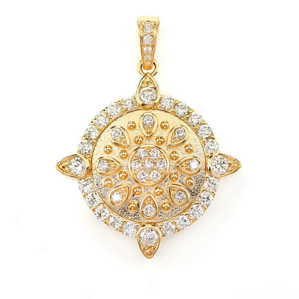 Each and every detail of this gold pendent is a reflection of the artistic skill of its design. With its exquisite material and skilled artistry this pendant is a testimony to the elegance and sophistication Ornate Diamond Cluster Medallion Pendant 14k.